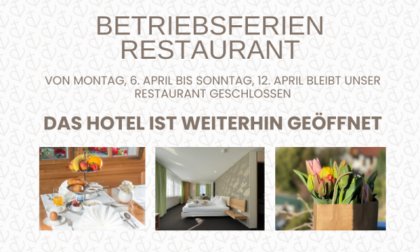Vom Montag, 06. April bis Sonntag, 12. April bleibt unser Restaurant geschlossen.